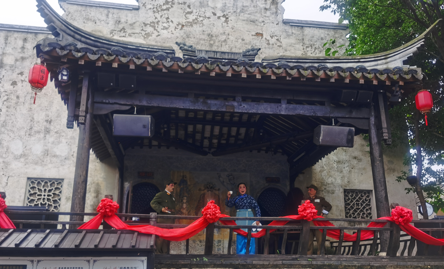 在橫涇老街戲臺,黨員們現(xiàn)場聆聽了革命樣板戲京劇《沙家浜》片段,親身感受到了京劇的魅力和革命年代的軍民魚水之情,感受到了當(dāng)年敵我雙方斗智斗勇,阿慶嫂的形象令人印象深刻。